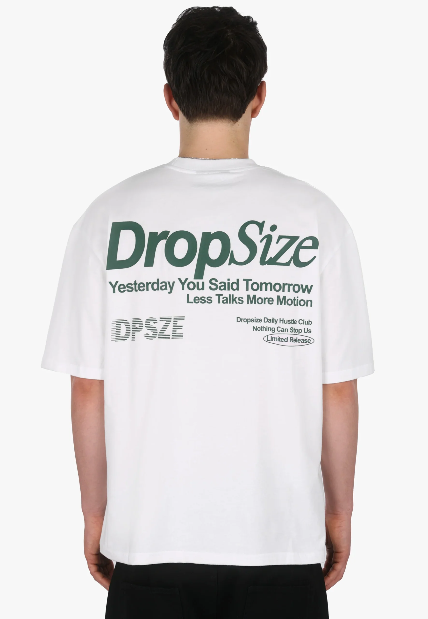Entfache deine Ambitionen mit dem Hustle Club Graphic Tee, einem Highlight der limitierten Dropsize-Kollektion. Dieses Oversize-Shirt in Weiß besticht durch einen auffälligen grünen Schriftzug auf dem Rücken mit motivierenden Sprüchen wie „Yesterday You Said Tomorrow“ und „Less Talks More Motion“. Der kastenförmige Schnitt und die überschnittenen Schultern sorgen für maximalen Tragekomfort und einen stylischen Look. Ob im Fitnessstudio oder auf der Straße – dieses Graphic Tee erinnert dich immer wieder daran, in Bewegung zu bleiben.